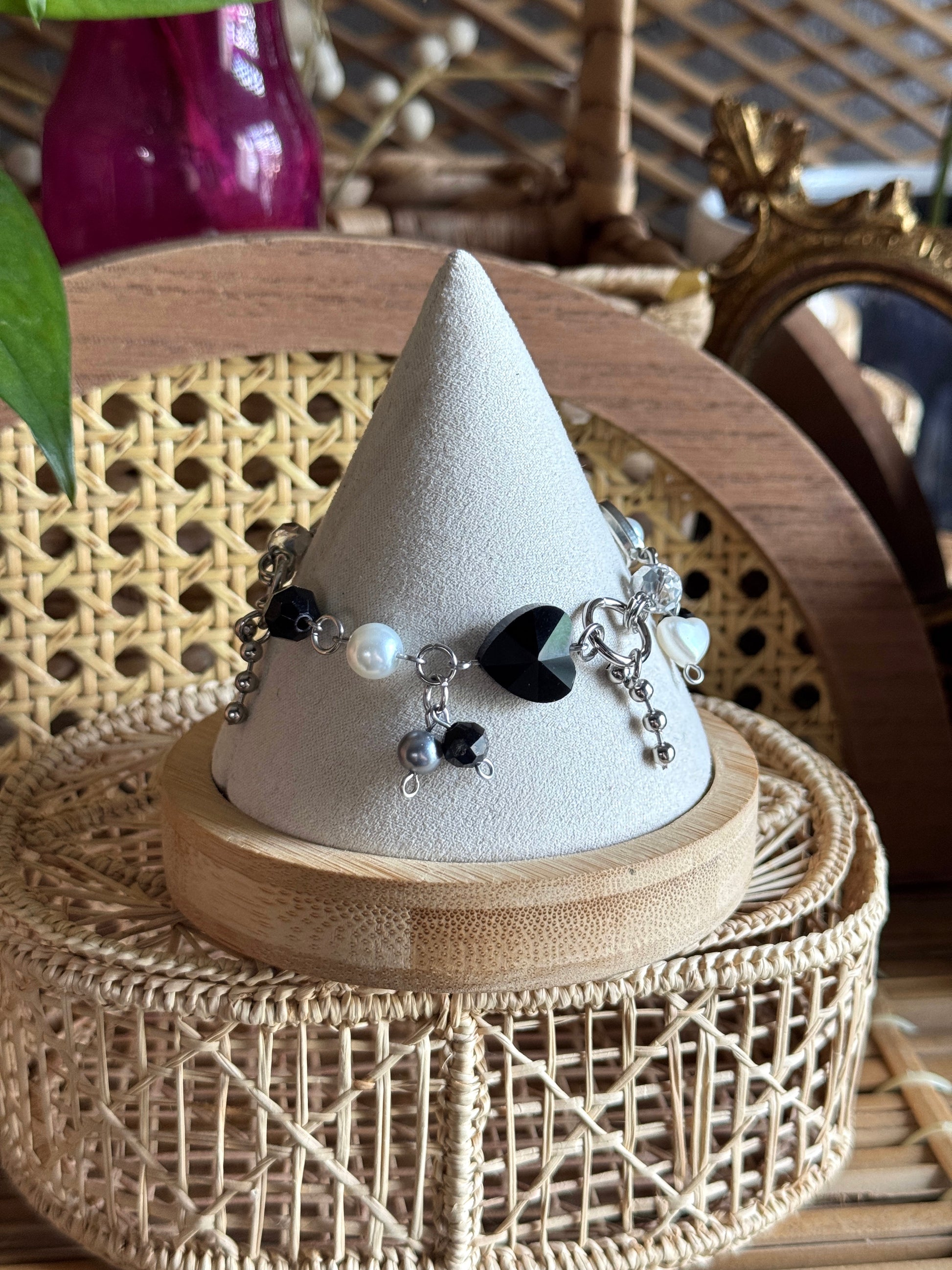 7.25 inch fully stainless steel clutter charm bracelet various black, pearl, and silver glass, czech, and acrylic beads, and stainless steel ball chains!