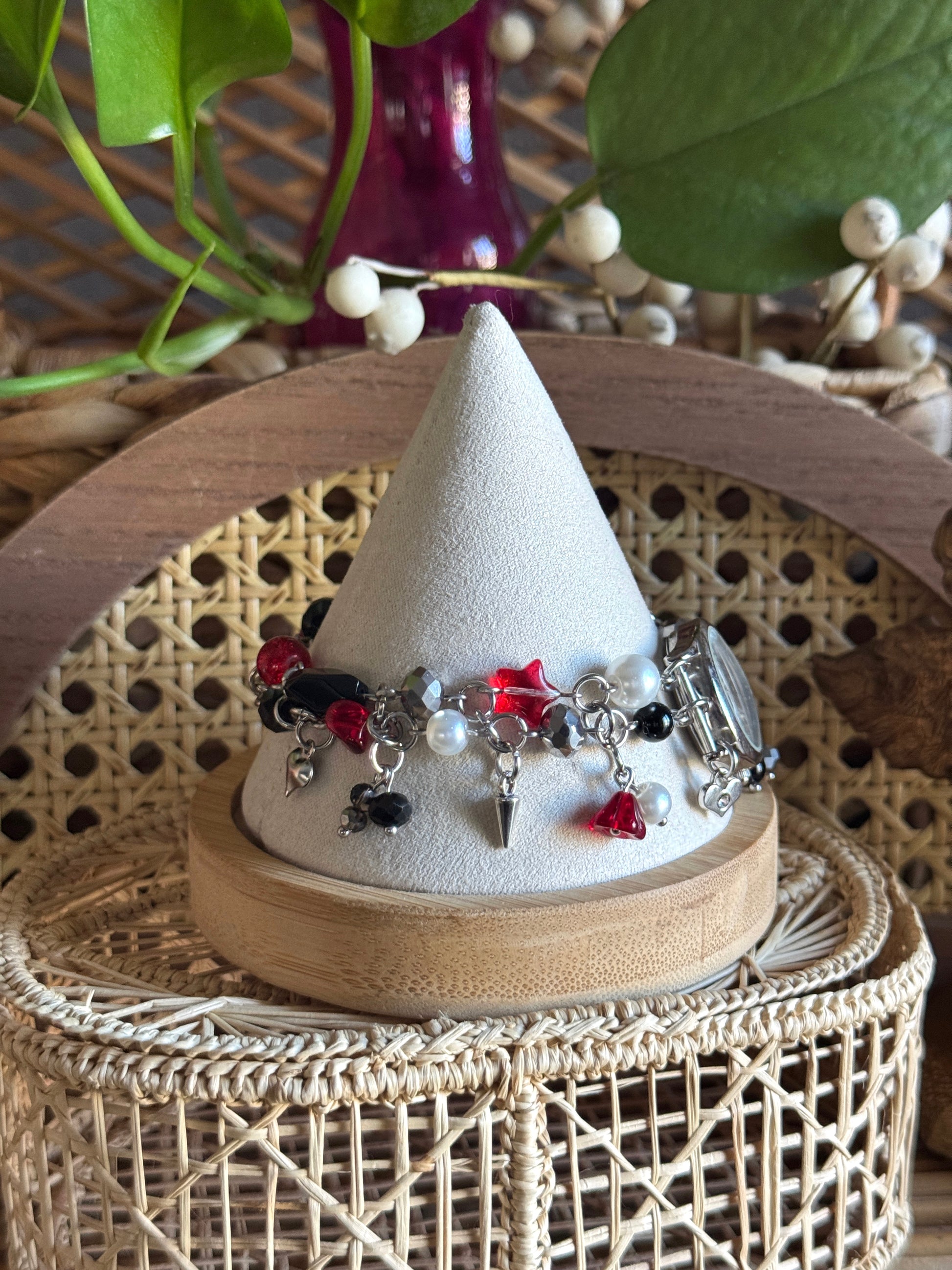 stainless steel double layered clutter charm bracelet with various black, silver, red, and pearl glass, czech, and stone beads, stainless steel charms, and an vintage upcycled betty boop valdawn watch face!