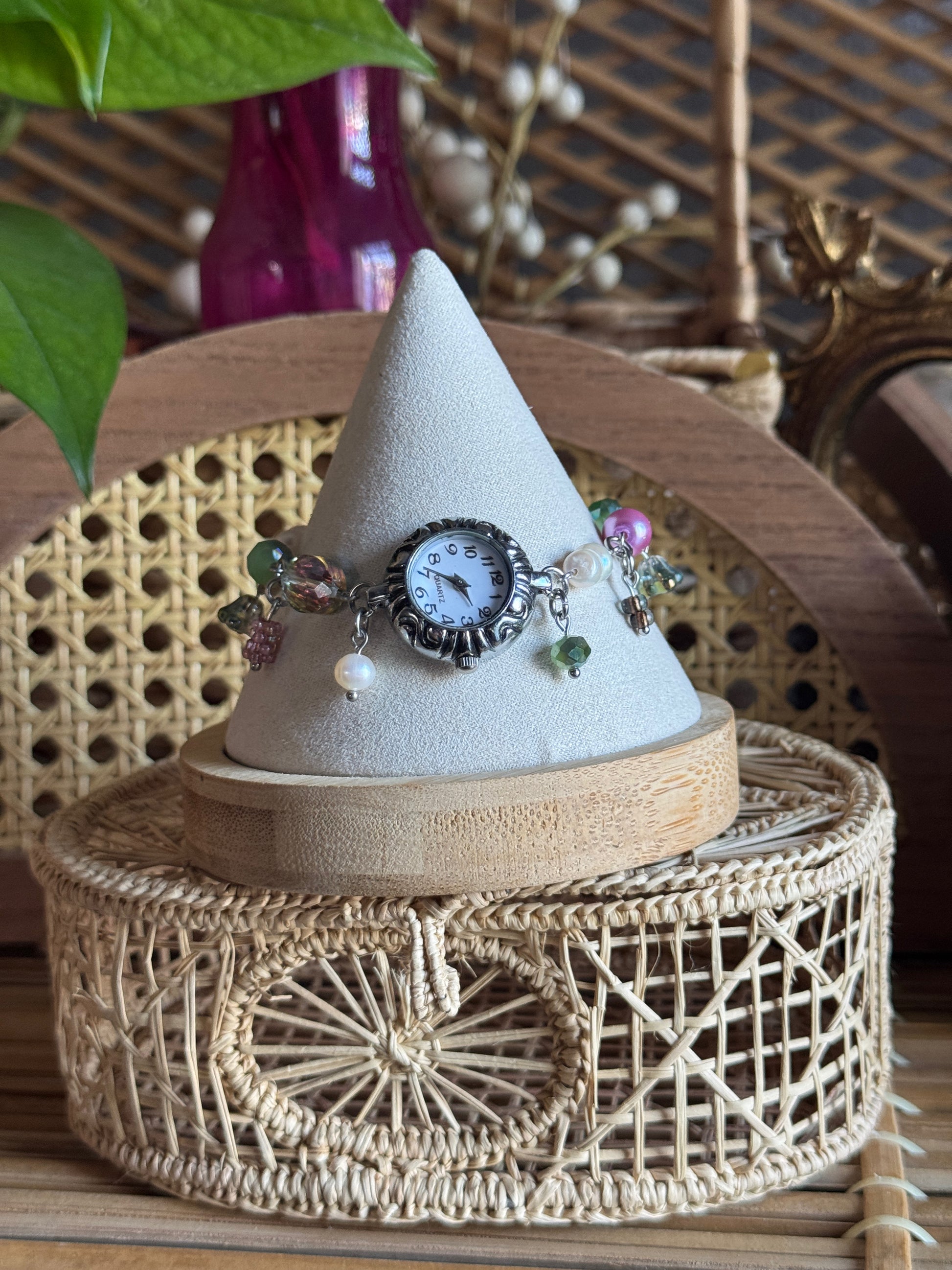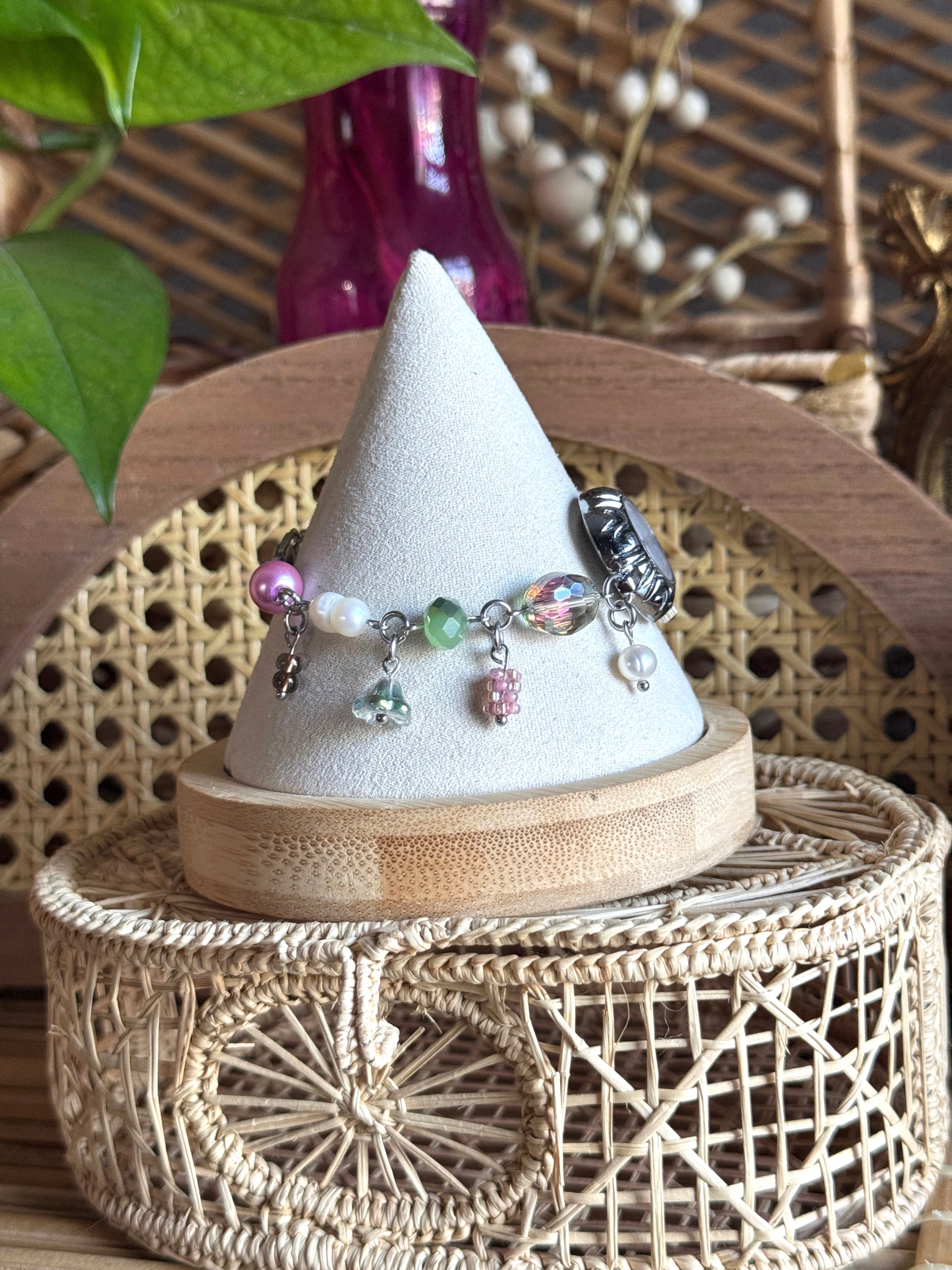 7.25 inch fully stainless steel clutter charm bracelet various pink/mauve taupe, brown, and green glass and czech beads, freshwater pearls, and a repurposed watch face! 💐