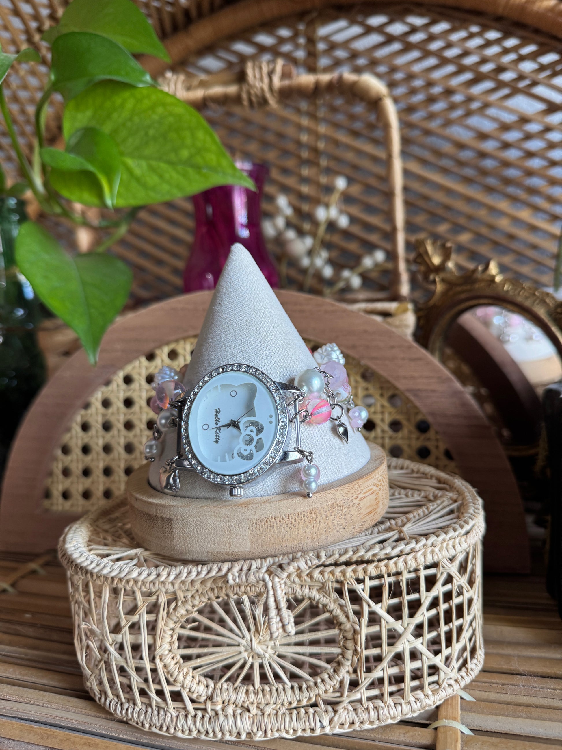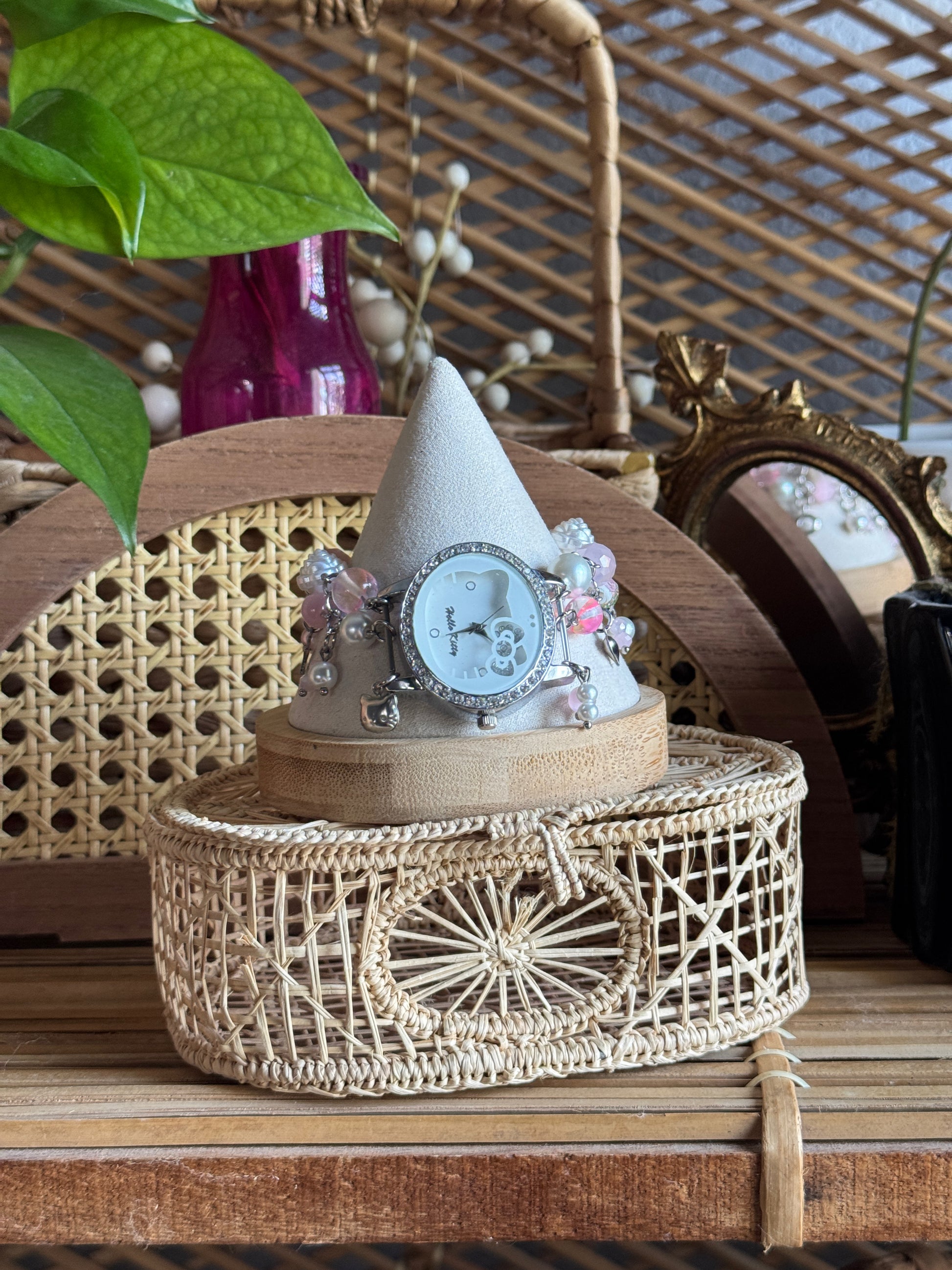 8 inch fully stainless steel clutter charm bracelet various pink & pearl glass, czech, and acrylic beads, a oval shaped rhinestone hello kitty watch face & stainless steel charms!