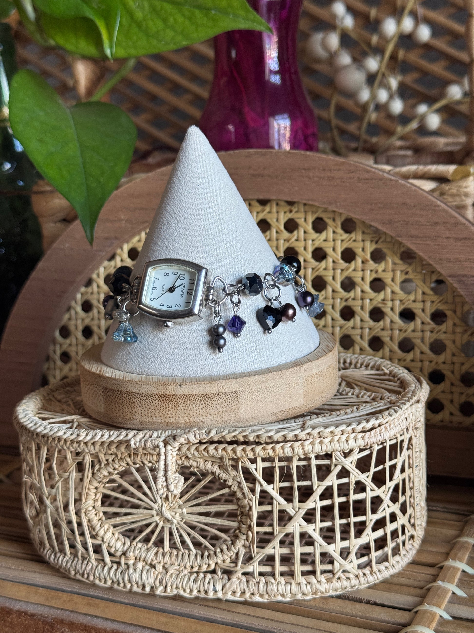 7.75 inch fully stainless steel clutter charm bracelet with various black, dark blue, brown, purple, & silver glass, stone, and czech beads, and a repurposed geneva watch face! ✨🖤