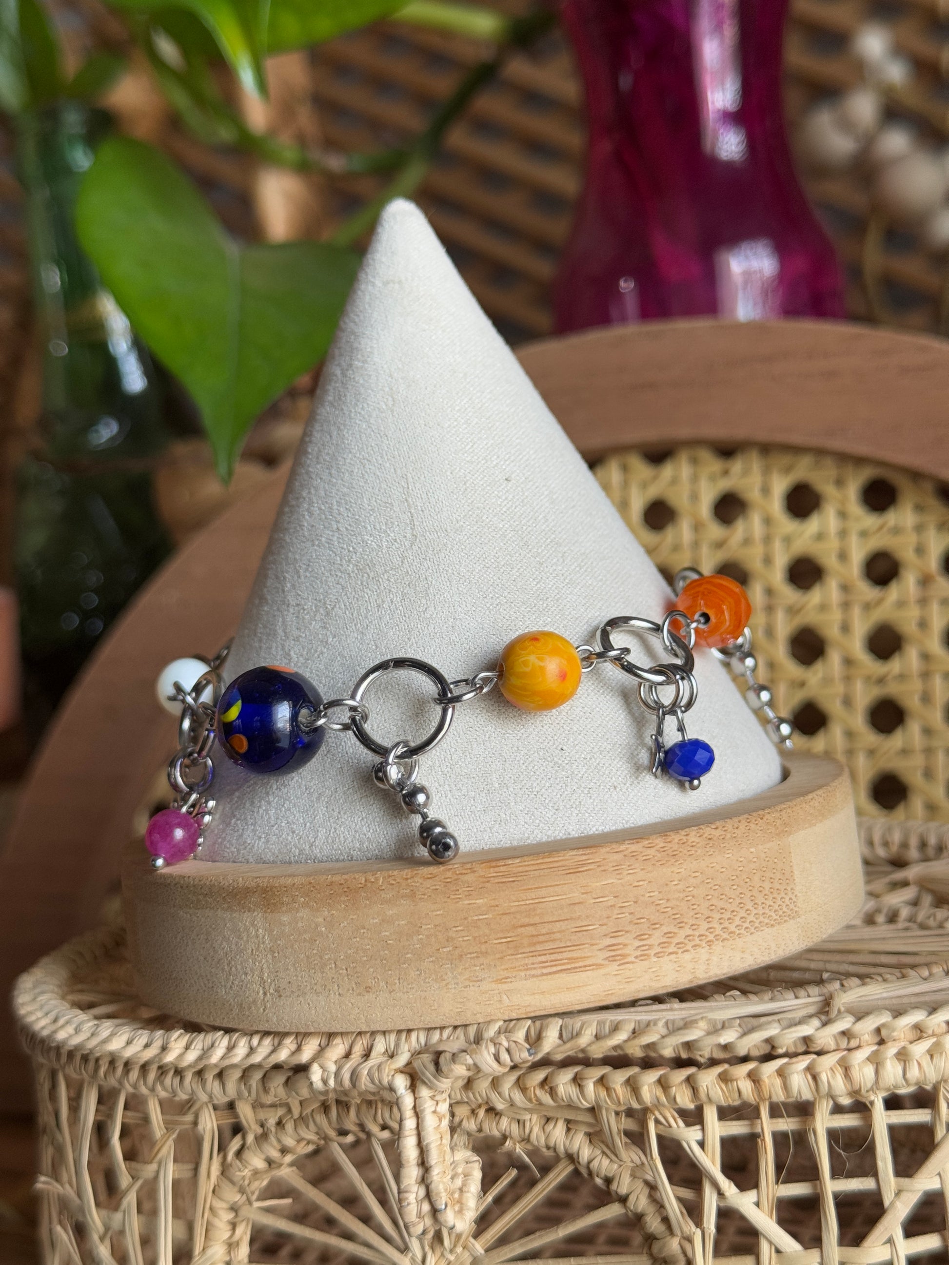 8.5 inch fully stainless steel clutter charm bracelet various blue, orange, yellow, and magenta czech, and glass beads, and stainless steel charms!