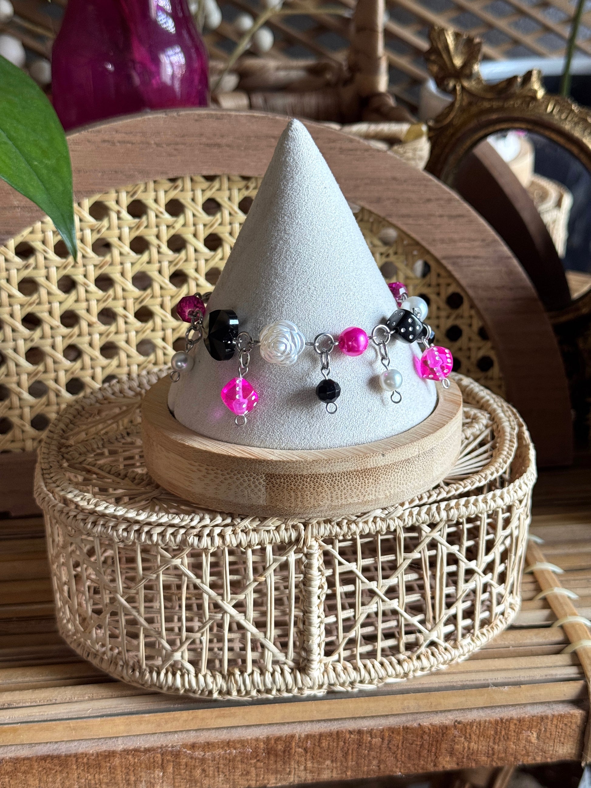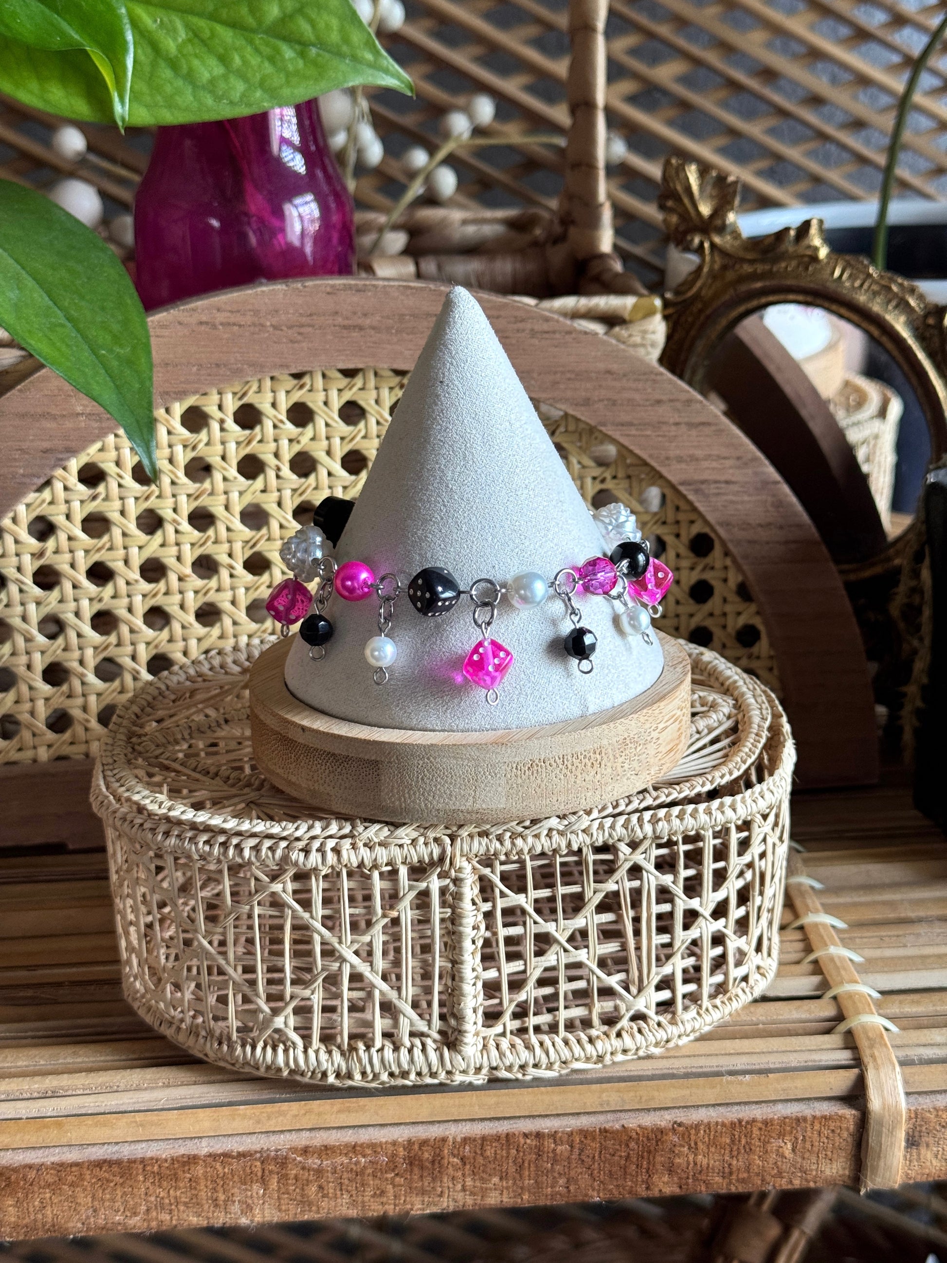 7.75 inch fully stainless steel clutter charm bracelet various black, pearl, and magenta / pink glass, czech, and acrylic beads!