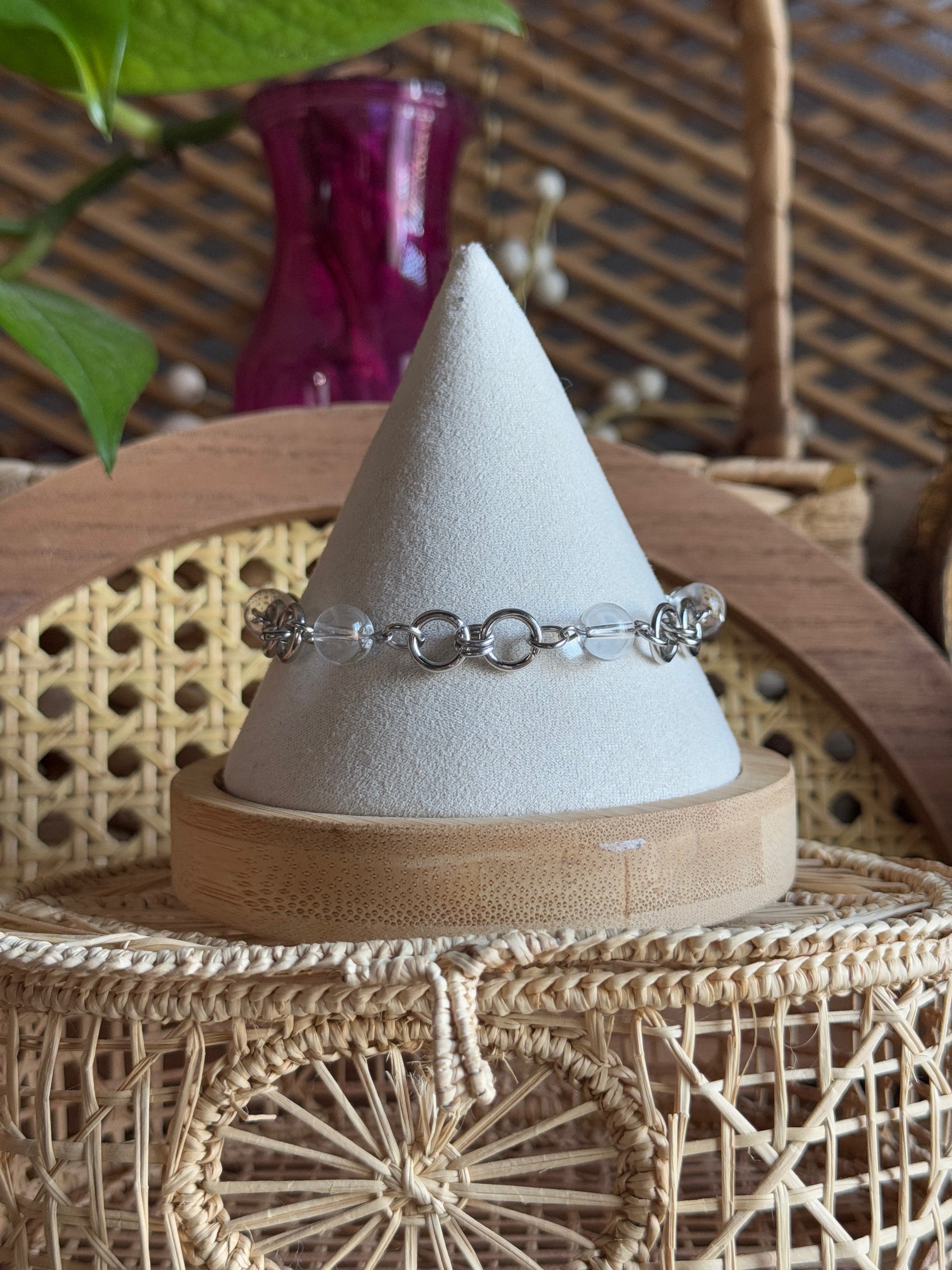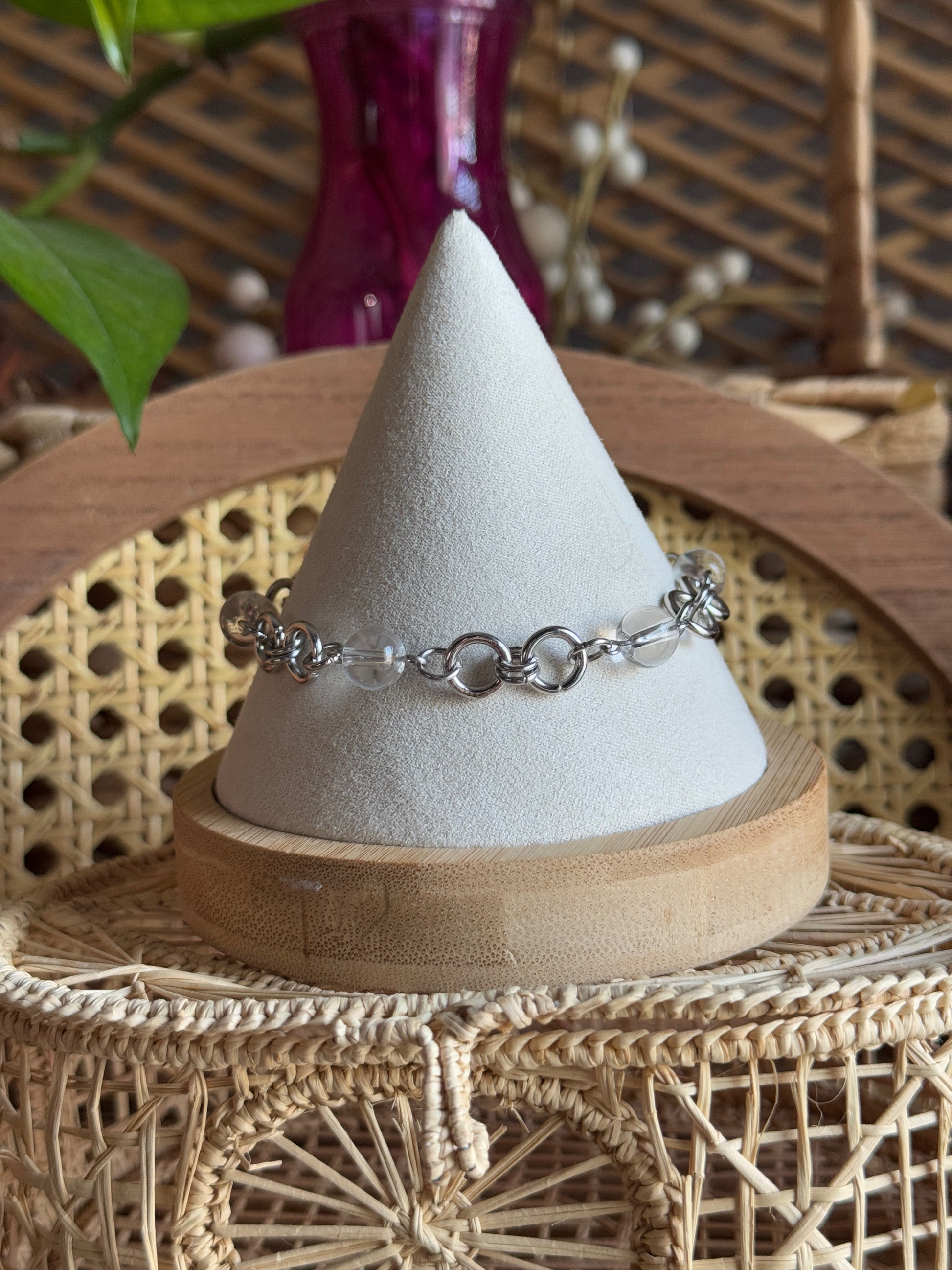 completely stainless steel bracelet with large & small jump rings to create a chainmaille style charm bracelet with clear glass beads! ⛓️