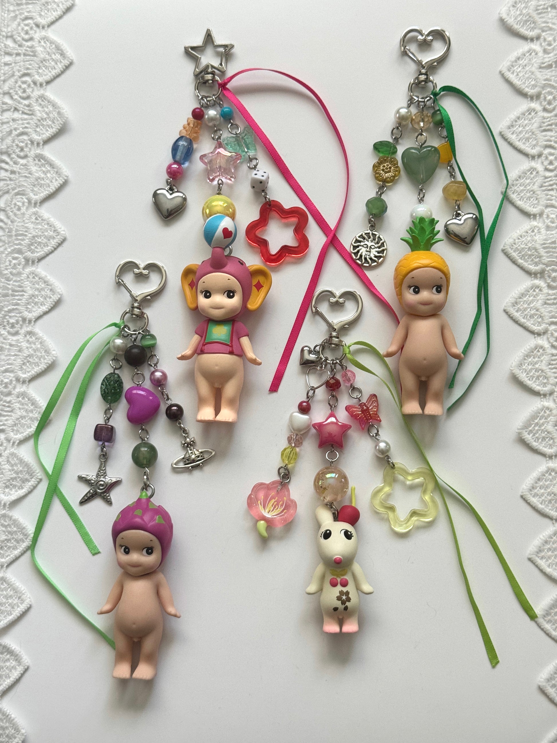 silver heart clasp keychain with various glass + acrylic beads, charms, and a DUPE robby cherry blossom sonny angel
